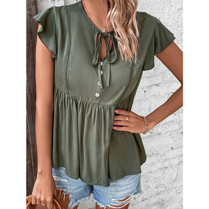 Buttoned Tie Neck Flutter Sleeve Babydoll Top