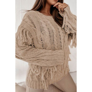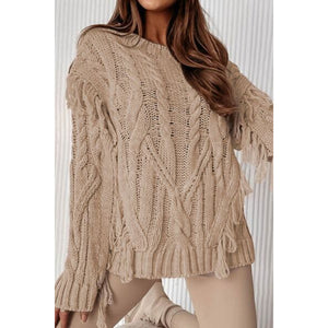 Cable-Knit Fringe Round Neck Sweater