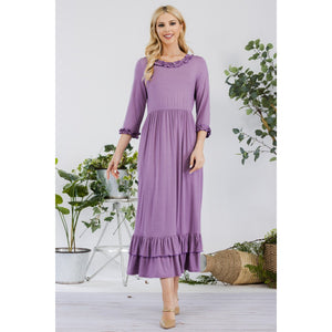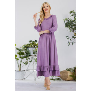 This classic dress has us completely enamored! The timeless A-line silhouette gracefully extends from the waist to flatter all figures by gently flaring over the hips. Complete with elegant 3/4 sleeves, a charming ruffle round neckline, convenient side pockets, and a delightful ruffle layered hemline, this dress is truly perfection for any occasion.