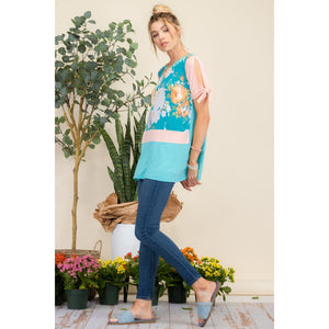 Classic round neck with open tie sleeves and floral print color block contrast. This is a loose fitting tunic top. This unique yet classic top will never go out of style!