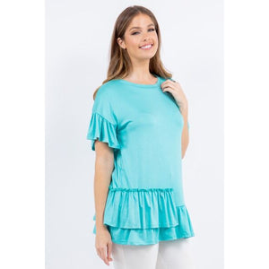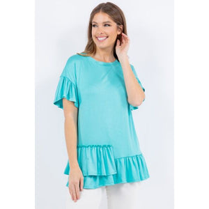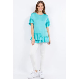 A modern twist on a classic top, we added asymmetrical hem and cute ruffle sleeves. This top is perfect for every occasion, it is flowy and soft. Pair this style with your favorite bottoms, and favorite accessories! You will look effortlessly beautiful.