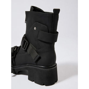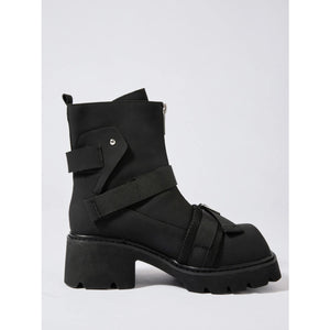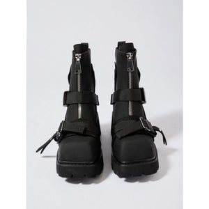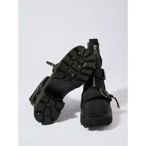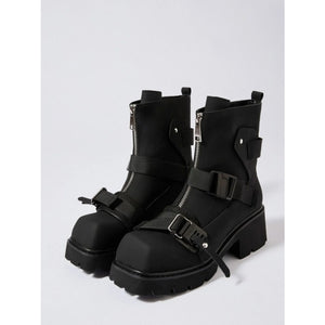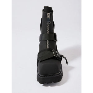 Chunky Platform Boots with Buckle Straps and Front Zip