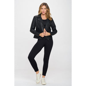 Studded Classic Moto Faux Leather Jacket is a bold and chic statement piece that exudes attitude and style. Crafted from high-quality faux leather, this jacket features studded details on the shoulder patch for a touch of edgy flair. The zipper arm sleeves add a modern and dynamic element to the design, while the zipper pockets offer both style and functionality. Featuring an asymmetrical zipper closure, this jacket has a unique and eye-catching appeal that sets it apart from the rest. Elevate your look with the Studded Classic Moto Faux Leather Jacket and make a fashion-forward statement wherever you go.
