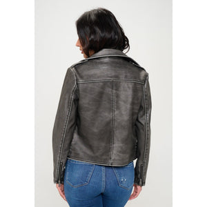 This zip-up biker jacket features a stylish design with a notched lapel and a belt for a trendy look. The asymmetrical zipper adds an edgy touch to the jacket. Two zipper pockets provide practical storage options. Ideal for adding a cool and chic vibe to any outfit.