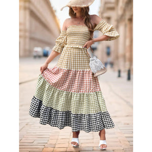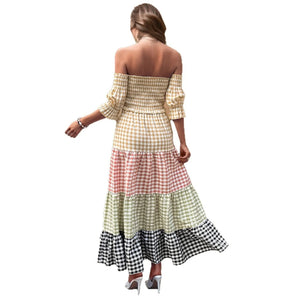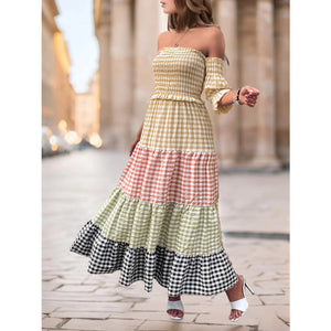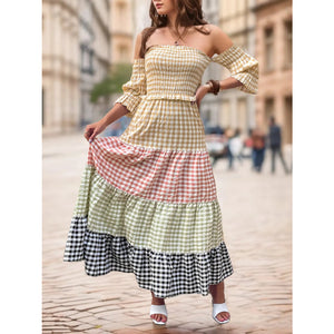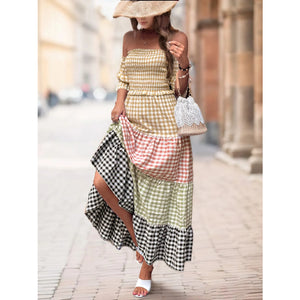 Color Block Plaid Off-Shoulder Maxi Dress