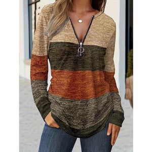 Color Block Quarter Zip Long Sleeve Blouse