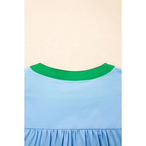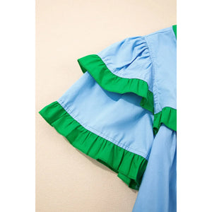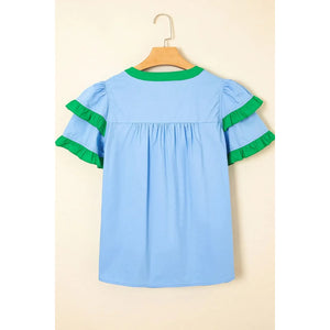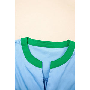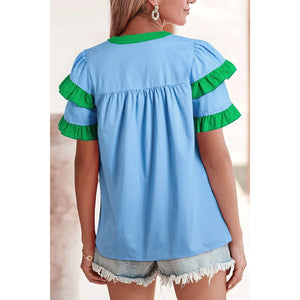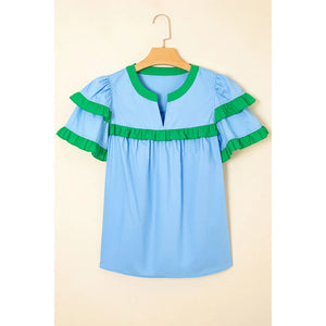Contrast Notched Neck Frilly Detail Short Sleeve Blouse