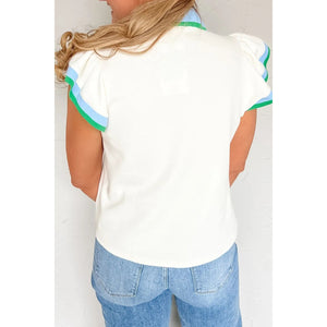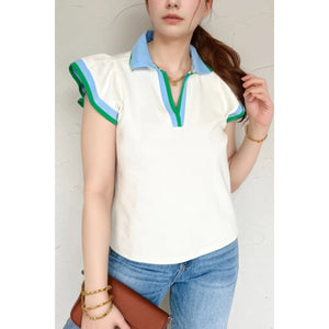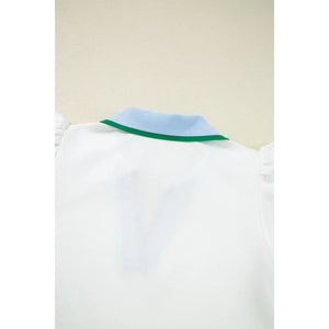 Contrast Ruffled Sleeve Collared V Neck Blouse