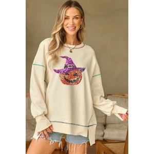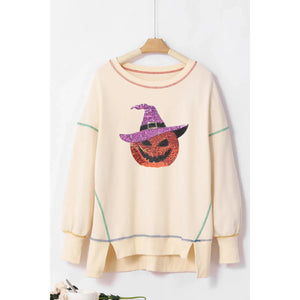 Contrast Stitching Sequin Pumpkin Round Neck Long Sleeve Sweatshirt