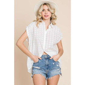 The Eyelet Crisscross Back Button Up Shirt is a chic choice for any fashion-forward individual. Made from a lightweight and breathable fabric, it offers comfort and versatility. The eyelet detailing adds a touch of femininity and elegance to the shirt, while the crisscross back design creates an eye-catching and unique look. With its button-up front, it offers a classic and polished silhouette. This shirt can be easily dressed up or down, making it suitable for both casual and dressier occasions. Whether paired with jeans for a casual day out or with a skirt for a more sophisticated look, the Eyelet Crisscross Back Button Up Shirt is sure to turn heads and make a stylish statement.