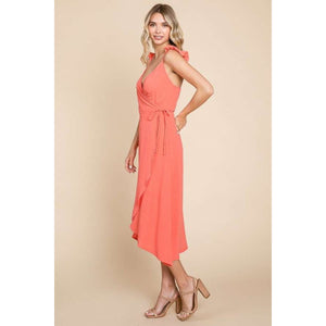 The Ruffle Detail Surplice Wrap Slip Dress is a stunning and versatile piece that exudes femininity and charm. With its delicate ruffle detailing and flattering wrap silhouette, this dress is perfect for any special occasion or evening event. The soft, flowy fabric moves beautifully with every step, ensuring both comfort and style. Embrace your elegance and grace in this lovely dress that is sure to turn heads wherever you go.