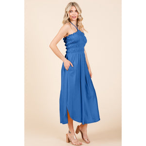 This Tie Back Shirring Dress with Pockets combines style and functionality for a versatile wardrobe staple. Featuring shirring on the bodice, this dress offers a flattering and comfortable silhouette. The addition of pockets provides convenience and practicality, perfect for carrying small essentials. Whether dressed up with heels or styled casually with sandals, this dress is perfect for various occasions. Elevate your look with this effortlessly chic and on-trend dress that seamlessly blends fashion and comfort.