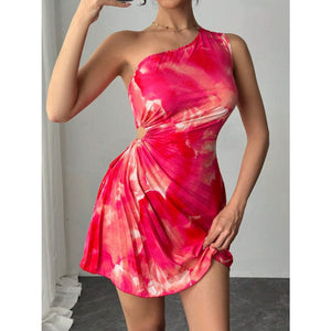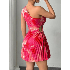 Cutout Drawstring Pleated Tie-Dye Sleeveless Mini Dress