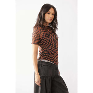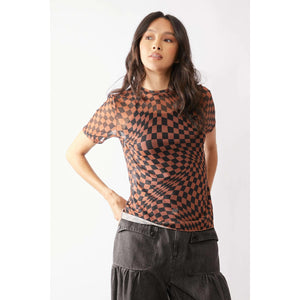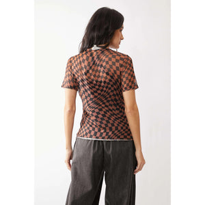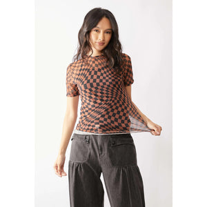 Davi & Dani Checker Board Printed Mesh Short Sleeve Top