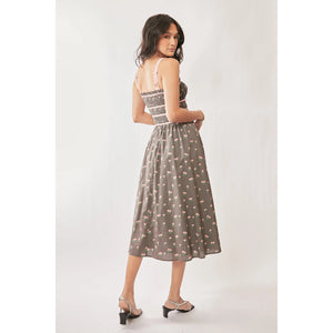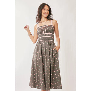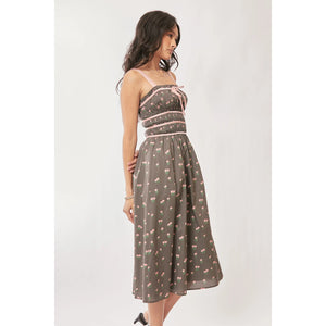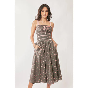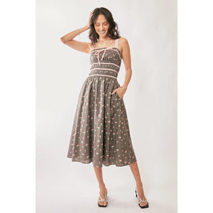 This charming midi dress features a classic vintage-inspired design with a modern twist. Made from lightweight fabric with a delightful polka dot pattern in gray and cream. The smocked bodice provides both style and comfort, while the spaghetti straps add feminine elegance. The dress is enhanced with contrast trim detailing at the waist and neckline. The practical side pockets and midi length make it perfect for various occasions. The A-line silhouette creates a flattering fit suitable for different body types. Ideal for summer events, casual outings, or dressed up for special occasions.