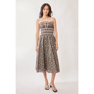 Davi & Dani Contrast Velvet Tape Smocking Bodice Midi Dress