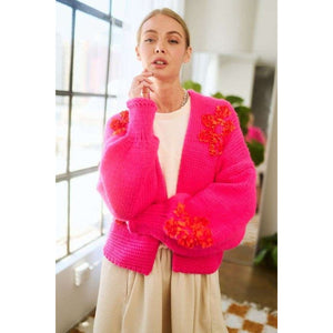 A floral applique open front drop shoulder cardigan is a stylish and feminine addition to your wardrobe. The floral appliqués add a touch of whimsy and texture to the cardigan, creating a romantic and delicate look. The open front design allows for effortless layering over any outfit, while the drop shoulder silhouette adds a relaxed and cozy feel. This cardigan is perfect for adding a soft and elegant touch to your everyday outfits, whether you're running errands or meeting friends for a coffee date. The floral appliqué detailing adds a special and eye-catching element that sets this cardigan apart from the rest.