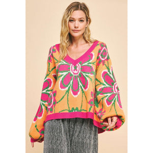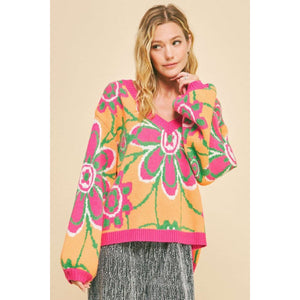 Davi & Dani Floral Contrast V-Neck Dropped Shoulder Sweater