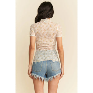 Davi & Dani Floral Mesh Mock Neck Short Sleeve Top