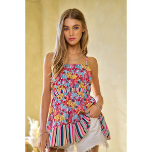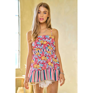 Davi & Dani Floral Smocked Sleeveless Ruffle Back Tie Top