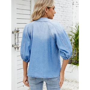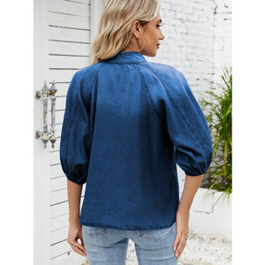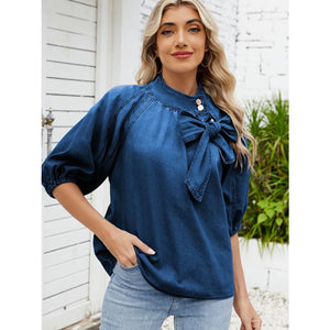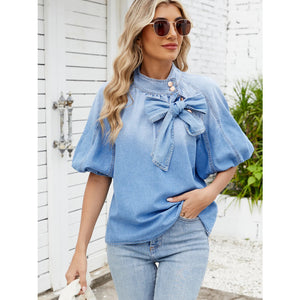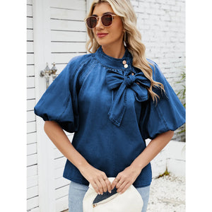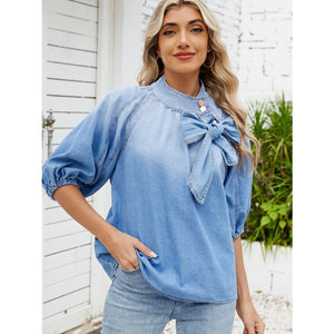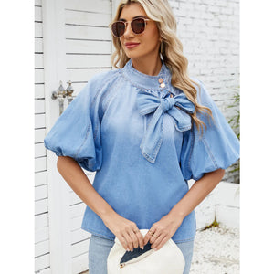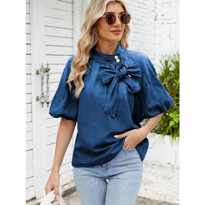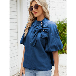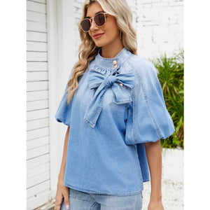 Denim Bow Tie Puff Sleeve Top