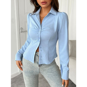 Devine Ruched Collared Neck Long Sleeve Shirt