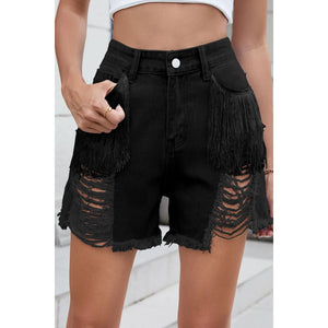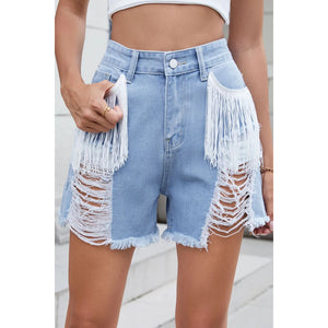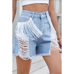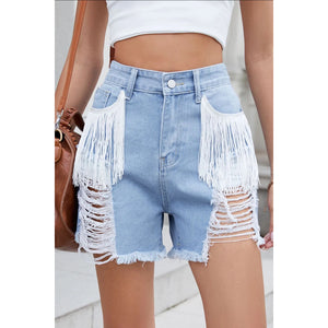 These premium distressed denim shorts feature a fashionable high-waisted silhouette with unique white fringe tassel details on the front pockets. Made from quality light wash denim, these shorts showcase fashion distressed ripping and raw hem detailing. The relaxed fit and classic 5-pocket design offer both style and functionality. Perfect for casual summer wear, these shorts combine vintage-inspired distressing with modern boho fringe elements for a distinctive look.