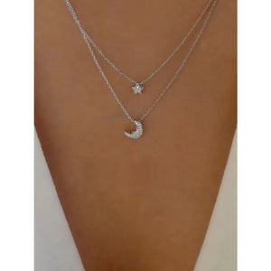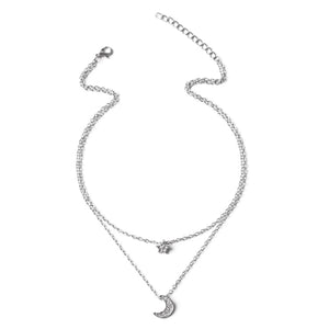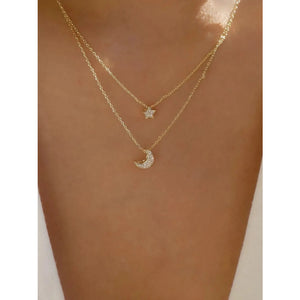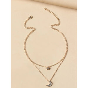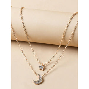 This stunning double layered necklace features delicate celestial-inspired pendants including a charming star and crescent moon design. Crafted with high-quality gold-toned metal chain, this necklace offers both elegance and versatility. The dual-layer design creates depth and visual interest, making it perfect for modern women who appreciate minimalist yet meaningful jewelry. The celestial motifs represent dreams, guidance, and feminine energy, while the adjustable chain length ensures comfortable wear for various necklines. Ideal for gifting or personal collection, this necklace combines contemporary fashion with timeless celestial symbolism.
