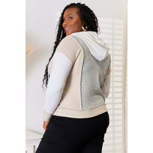 Double Take Color Block Exposed Seam Drawstring Hoodie
