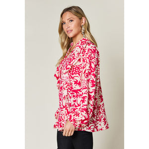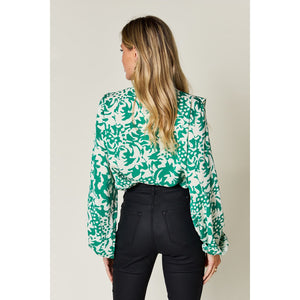 Double Take Full Size Printed Ruffle Trim Balloon Sleeve Shirt