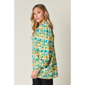 Double Take Full Size Printed Smocked Long Sleeve Blouse