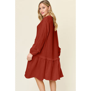 Double Take Full Size Texture Half Button Ruffle Trim Dress