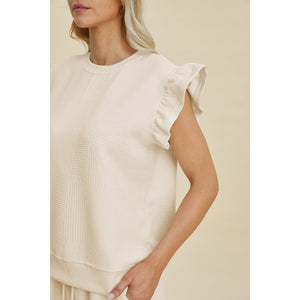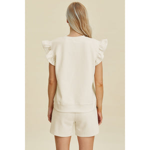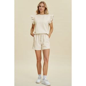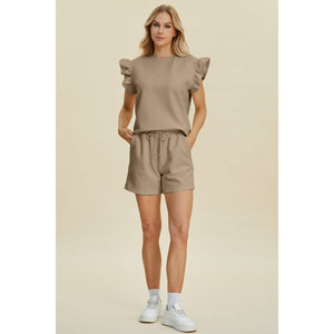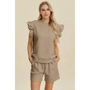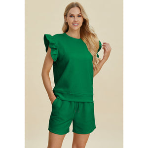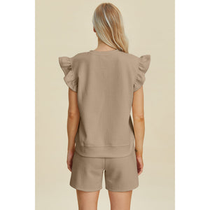 Double Take Full Size Texture Round Neck Ruffle Sleeve Top and Shorts Set