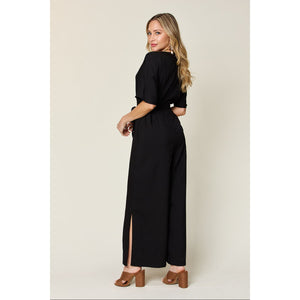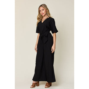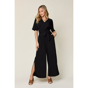 Double Take Full Size V-Neck Tie Front Short Sleeve Slit Jumpsuit