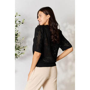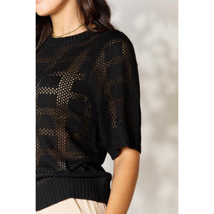 This solid knit top features a round neckline and half sleeves, providing a classic and versatile look. The ribbed trim adds texture and visual interest to the top, making it a stylish choice. With its regular length, it can easily be paired with different bottoms for a comfortable and fashionable outfit.