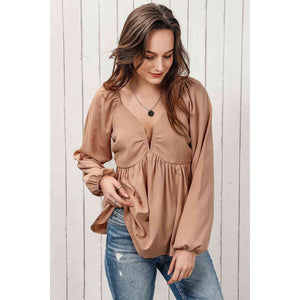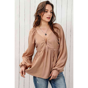 Double Take Tie Back Smocked Long Sleeve Babydoll Blouse