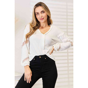 Add a touch of sophistication to your wardrobe with this V-neck dropped shoulder blouse. The V-neckline creates a flattering and feminine look, while the dropped shoulder design adds a relaxed and comfortable fit. This versatile blouse can be dressed up or down for any occasion, making it a stylish and timeless addition to your collection.
