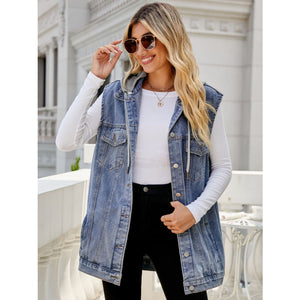 Drawstring Hooded Sleeveless Denim Top with Pockets