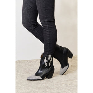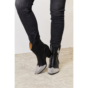 These boots feature a stunning array of rhinestones adorning the ankle, creating a captivating sparkle with every step. The pointed toe and chunky heel pay homage to classic cowboy boot design, while the ankle height offers a modern twist that's perfect for any occasion.