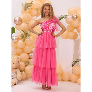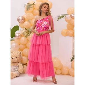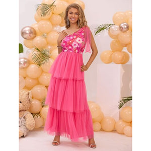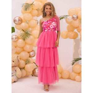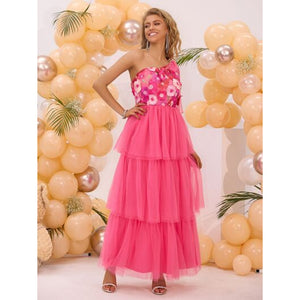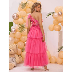 Embroidered Layered Single Shoulder Midi Dress