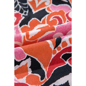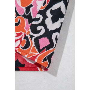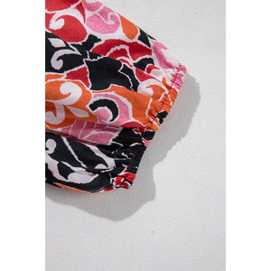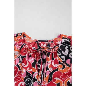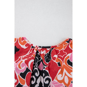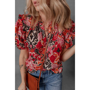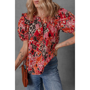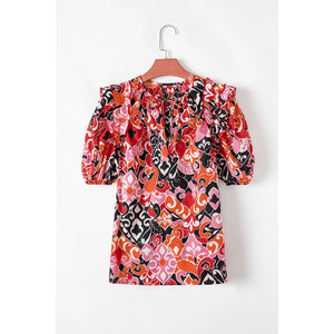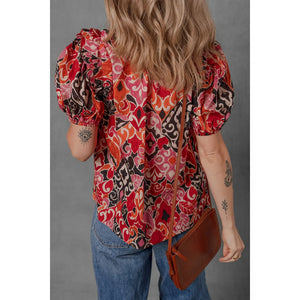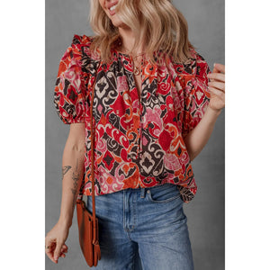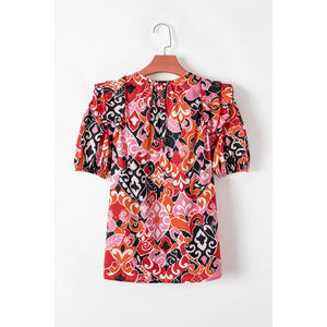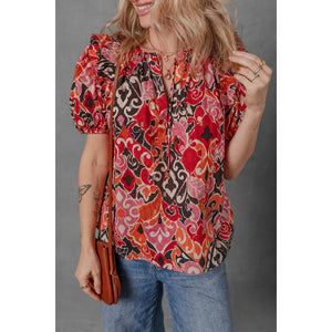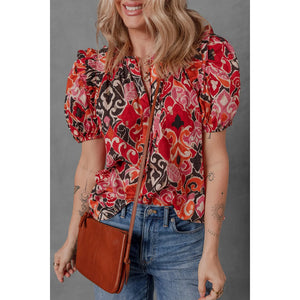 Ethnic Print Split Neck Short Puff Sleeve Blouse