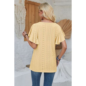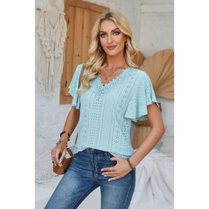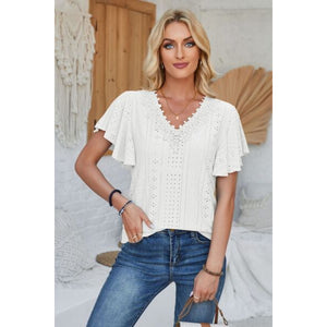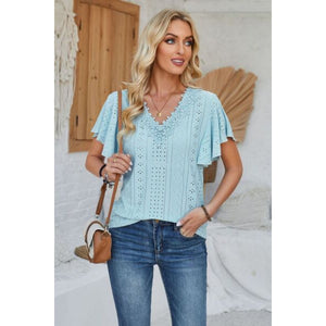 Eyelet Applique V-Neck Cap Sleeve T-Shirt