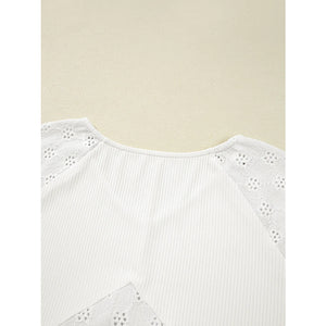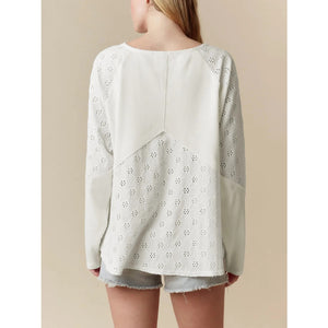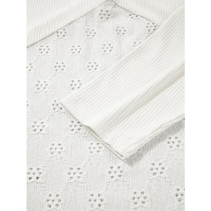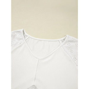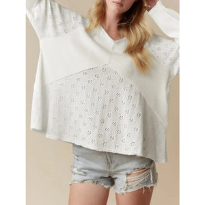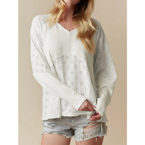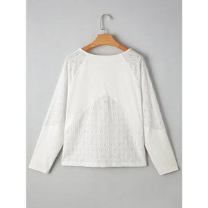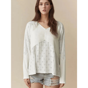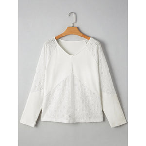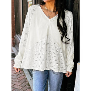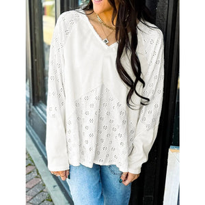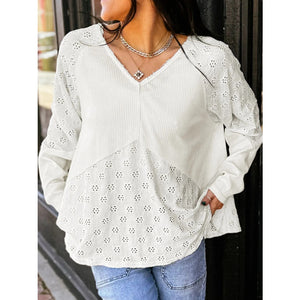 Eyelet Embroidered Loose V Neck Long Sleeve Top