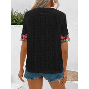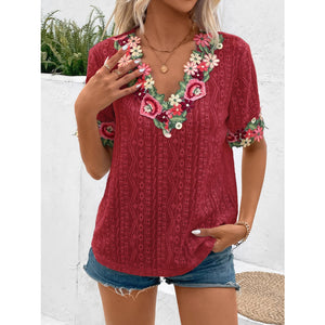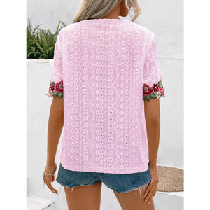 Eyelet Embroidered V-Neck Short Sleeve Blouse