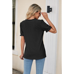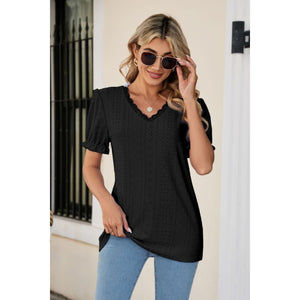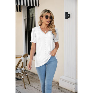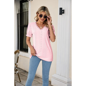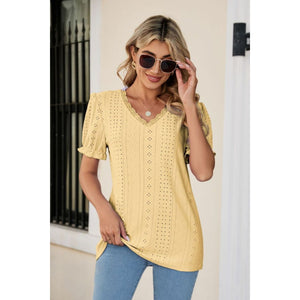 Eyelet Flounce Sleeve Scalloped V-Neck Top