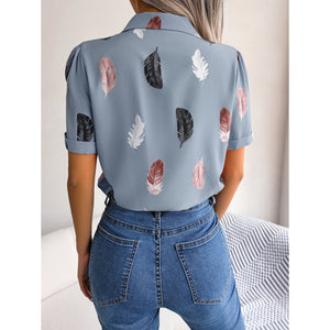 Feather Print Lapel Collar Puff Sleeve Shirt
