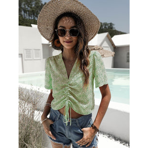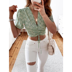 Floral Drawstring Deep V Cropped Blouse