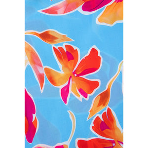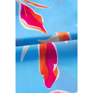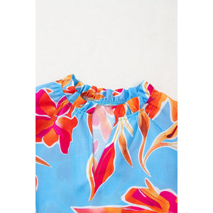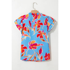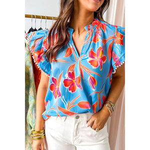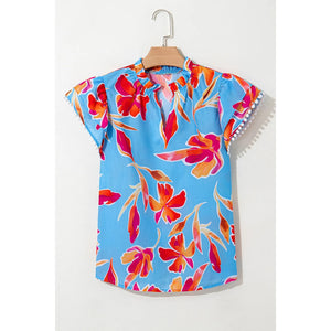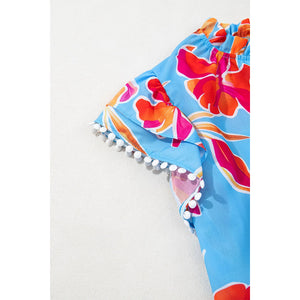 Floral Print Notched Pompom Trim Flutter Sleeve Blouse