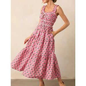 Floral Print Ruffled Midi Dress with Pockets