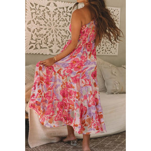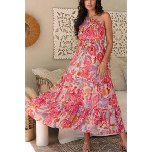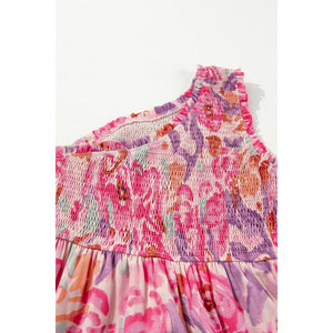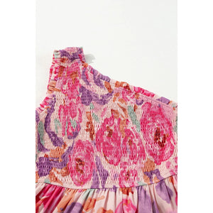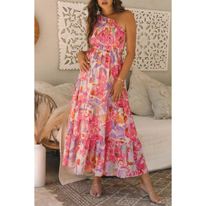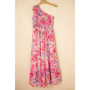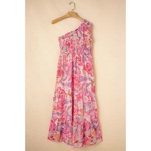 Floral Print Shirred One Shoulder Maxi Dress